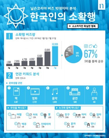 [세계로컬신문 박정선 기자] 닐슨코리아는 최근 트렌드인 '소확행(소소하지만 확실한 행복)'과 관련된 버즈량이 올해 월 평균 8000여건 이상을 기록했으며 7개월 연속 꾸준히 증가하고 있는 것으로 나타났다.