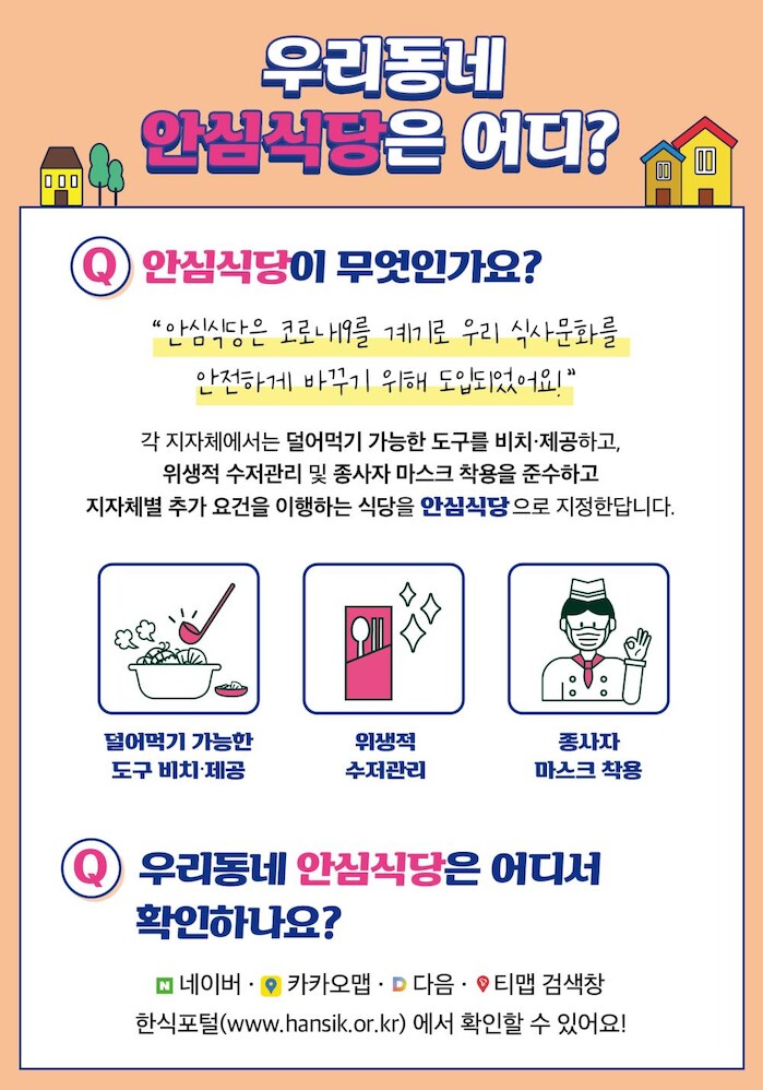 안심식당은 소비자가 안심하고 이용할 수 있도록 덜어먹기 가능한 도구 제공, 위생적인 수저 관리, 종사자 마스크 착용, 매일 2회 이상 자체 소독 등 생활방역 수칙을 준수하는 음식점이다.