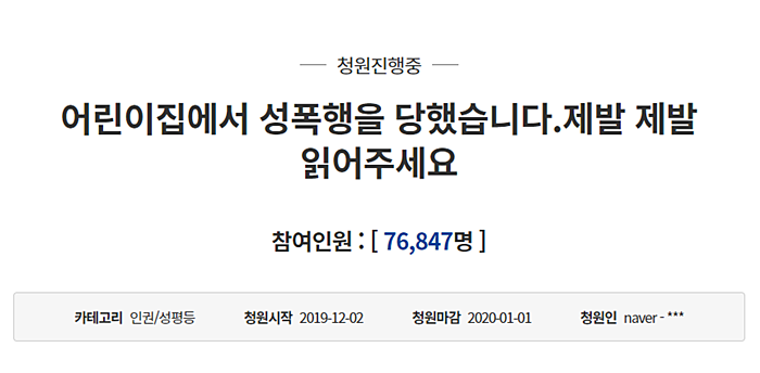 | ▲성남시 한 국공립어린이집에서 아동 간 성폭력 의혹이 제기된 가운데, 정부와 성남시 모두 관련 조사 입장을 밝혔다.(사진=청와대 국민청원 홈페이지 게시판 갈무리) |