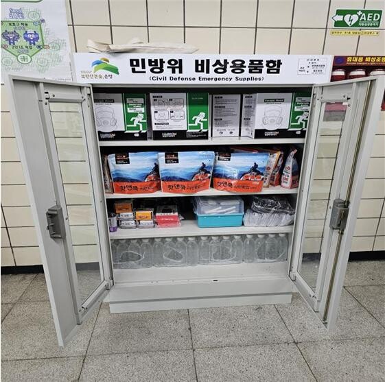서울시는 지하철 역사, 아파트 및 빌딩 관리사무소 등 25개 자치구 내 민방위대피소 2,900여 개소 중 소유주 동의를 받은 시설 2,600여개소에 비상용품함 3,000여 개, 350ml 병물 아리수 29만 병을 비치했다.