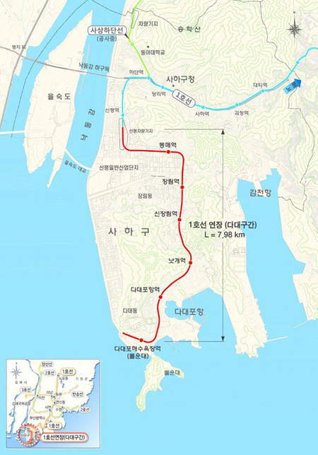 이번에 개통하는 부산도시철도 1호선 연장 다대구간은 현재 종점역인 신평역에서 다대포해수욕장역을 잇는 노선으로 연장구간은 7.98km(6개 정거장)이다.