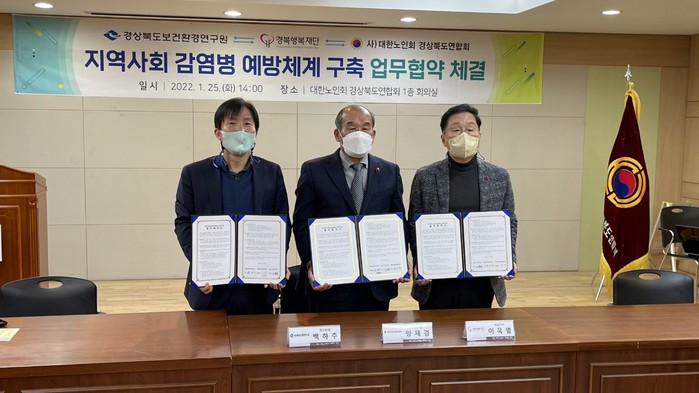 [세계로컬타임즈 이장학 기자] 경상북도(보건환경연구원)는 25일 대구 대한노인회경북연합회에서 경북행복재단 등과 경로당을 포함한 노인복지시설의‘지역사회 감염병 예방체계 구축’을 위한 업무협약 체결했다고 밝혔다.