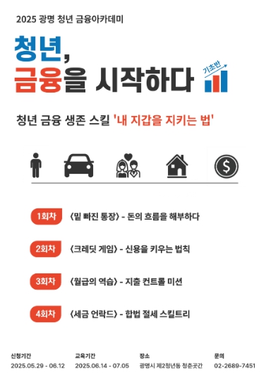 이번 교육은 39세 이하 광명시 거주 또는 활동 청년을 대상으로, 건전한 경제 습관을 기르고 실질적인 금융 지식을 익혀 경제적 자립 역량을 높이는 데 목적이 있다.