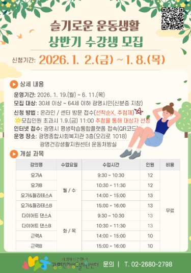 프로그램은 2026년 1월 19일부터 6월 11일까지 광명건강생활지원센터에서 운영한다.
