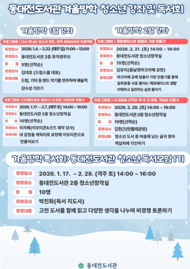 특히 이번 겨울방학에 새롭게 선보이는 ▲동대전도서관 청소년 독서 모임 1기는 청소년들이 고전 도서를 함께 읽고 자유롭게 생각을 나누는 독서회로, 책을 깊이 읽고 경쟁이나 평가 없이 서로 의견을 자유롭게 주고받으며 독서 활동에 대한 흥미를 느낄 수 있도록 하는 것을 목표로 한다.