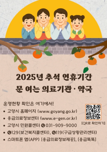 연휴 중 운영하는 의료기관 및 약국 현황은 ▲응급의료정보센터, ▲고양시청 누리집, ▲고양시 민원콜센터를 통해 확인할 수 있다.