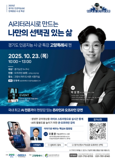 특강 1부는 국내 최고 AI전문 컨텐츠 크리에이터인 박설영 위드에이 컴퍼니 대표가 ‘AI리터러시로 만드는 나만의 선택권 있는 삶’을 주제로 강의하며, 2부는 경기대 오홍권 교수의 ‘이야기로 배우는 핵심AI 활용법’이 진행된다.