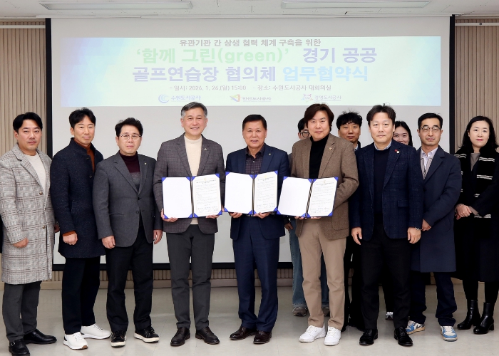 26일 공사에 따르면 공사는 이날 오후 더함파크 대회의실에서 광명도시공사, 안산도시공사 등과 ‘함께 그린(green) 경기공공골프연습장 협의체 업무협약식’을 가졌다.