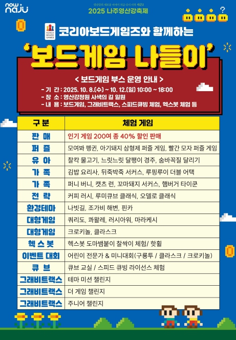 [세계로컬타임즈] 전라남도 나주시가 오는 10월 8일부터 12일까지 열리는 ‘2025 나주영산강축제’에서 남녀노소 누구나 즐길 수 있는 ‘보드게임 나들이’를 운영한다.
