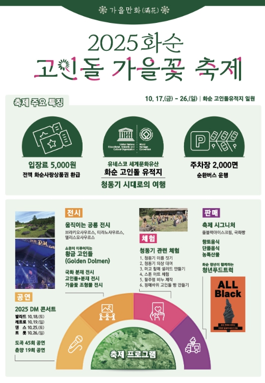 화순군 대표 축제로 '23, 24년 2년 연속 축제 콘텐츠 대상에 선정된'2025 화순 고인돌 가을꽃 축제'는 가을꽃과 청동기 체험, ‘가을만화’와 ‘고인돌 유니버스’로 정체성과 재미를 강화해 총 7개 구역에서 부대행사(2개) 포함 총 24개의 프로그램을 운영한다.