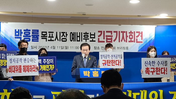| ▲박홍률 목포시장 예비후보 기자회견 모습.(사진=박 예비후보 측) |