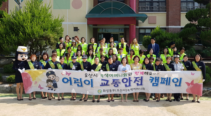 | ▲ 경기도 화성동부경찰서가 6일 운천초등학교 앞 사거리에서 화성동부 녹색어머니 연합회와 어린이 교통사고 예방 캠페인을 펼치고 기념촬영을 하고 있다. |