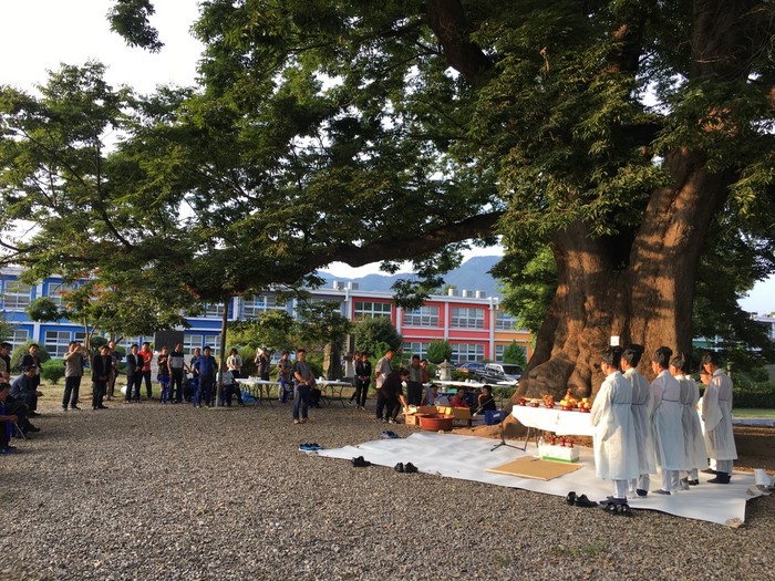 | ▲ 담양군 대전면 한재초등학교에서 주민들이 참여한 가운데 600년된 느티나무 앞에서 당산제를 지내고 있다.<사진제공=담양군청> |