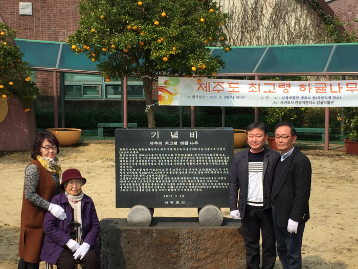 | ▲ 현문아 여사(왼쪽 두번째) 등 가족들이 29일 서귀포시 감귤박물관에 제주의 최고령 하귤나무를 기증한 후 기념촬영하고 있다.<사진제공=서귀포시청> |