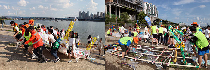 대회 첫째 날인 2일에는 메인 행사장인 뚝섬유원지 수변공원에서 진행됐으며 각 학교에서 수거해 온 페트병과 대회 사무국에서 준비한 페트병을 더해 약 6시간 동안 페트병 뗏목(이하 뗏목)을 제작했다.