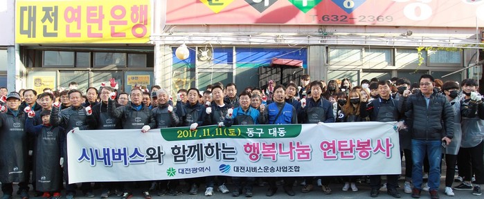 대전시는 11일 동구 대동에서 대전버스운송사업조합 김광철 이사장과 함께 ‘사랑의 연탄 나눔’ 봉사활동을 갖고 저소득가정과 독거노인세대에 연탄 5500장을 전달했다고 12일 밝혔다.