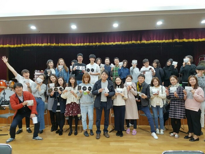 | ▲ 충주시립우륵국악단원들이 처음 제작한 음반을 들고 기념촬영하고 있다.<사진제공=충주시청> |