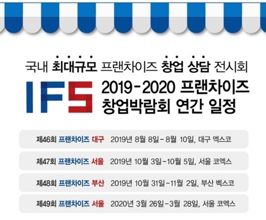 8월 8일부터 10일까지 3일간 대구 엑스코에서 프랜차이즈 관련 정보를 한 자리에 모아놓은 '2019 IFS 프랜차이즈 창업박람회'가 열린다. IFS는 국제프랜차이즈쇼(International Franchise Show)를 말한다.