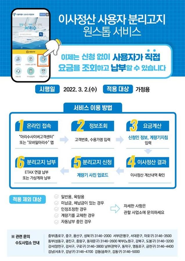 서울시가 시행하는 수도요금 이사정산 사용자 분리고지 원스톱(One-stop) 서비스는 3월부터 수도요금 고지서를 받는 가정용 세대에 한해 우선 실시하며, 올해 하반기까지 전 업종(일반용, 욕탕용)으로 확대될 계획이다.