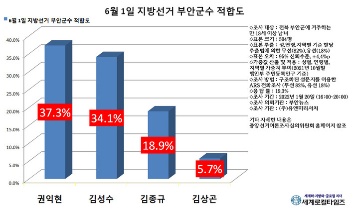 (주)유앤미리서치가 부안뉴스의 의뢰로 지난 20일 부안군에 거주하는 만 18세 이상 남·녀 504명을 대상으로 실시한 여론조사(중앙선거여론조사심의위원회 홈페이지 참조) 가운데 차기 부안군수 적합도를 묻는 질문에 권익현 현 부안군수가 37.3%, 김성수 전 부안군의회 의장이 34.1%을 얻었다.