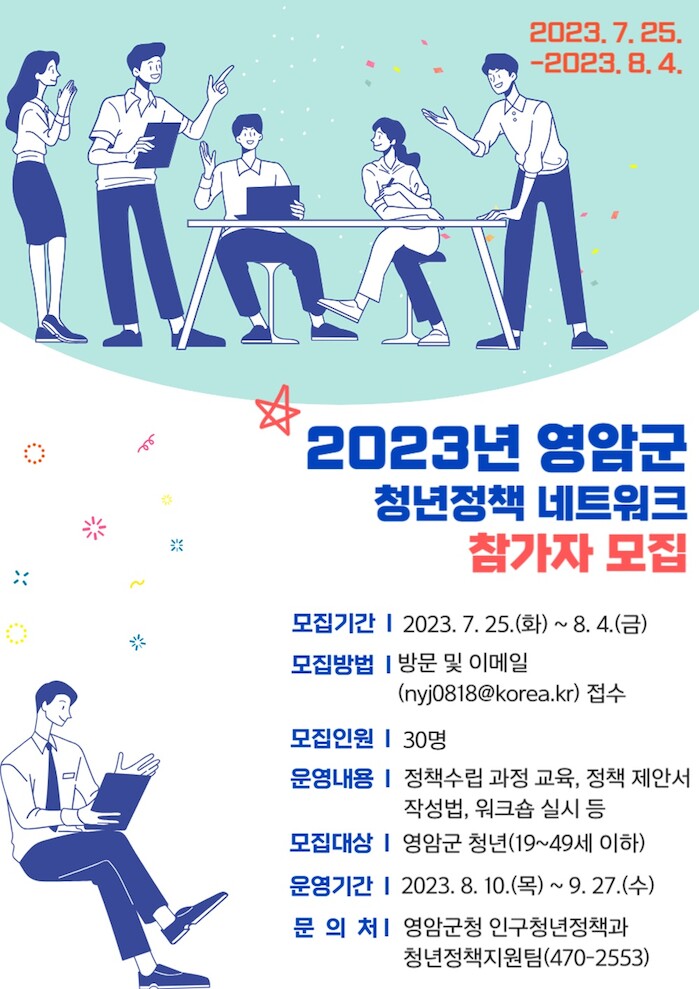 청년정책 네트워크에 참여할 청년은 영암군 홈페이지 ‘고시공고’란을 참고해 서류를 작성한 다음, 방문하거나 이메일로 접수할 수 있다. 기타 자세한 안내는 영암군 청년정책과 청년정책지원팀에서 한다.