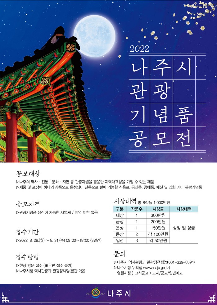 이번 ‘2022년 나주시 관광기념품 공모전’의 공모대상은 나주의 역사·전통·문화·자연 등을 활용하여 제작된 5만원 이하 가격의 식음료, 공산품, 공예품, 패션 및 잡화 기타 관광품으로, 제품 및 포장이 하나의 상품으로 완성되어 단독으로 판매할 수 있어야 한다.