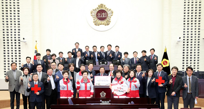 | ▲ 인천시의회는 적십자 특별회비를 전달하고 손 하트를 보이고 있다. (사진=인천시의회 제공) |