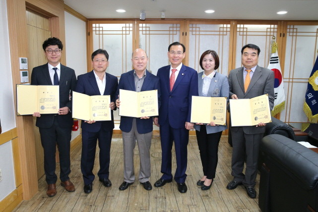 | ▲ 김익수 구미시의회 의장이 17일 의장실에서 2016년 회계연도 결산검사위원을 위촉한 후 기념촬영하고 있다.<사진제공=구미시의회> |