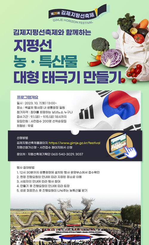 제25회 김제지평선축제는 오는 10월 5일부터 10월 9일까지 개최되며 일부 프로그램의 경우 내달 1일부터 15일까지 김제지평선축제 홈페이지를 통해 사전 신청을 받는다.