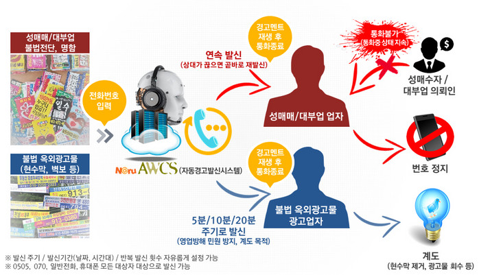 이 시스템은 불법 현수막과 음란·퇴폐·대출 등 전단지에 적힌 전화번호로 5~20분 간격으로 자동 발신 전화를 거는 시스템이다. 지속적으로 전화를 걸어 옥외 광고물 위반사항을 안내함과 동시에 과태료 경고 메시지를 보냄으로써 업자가 전화 영업을 할 수 없도록 무력화시키는 방식이다.