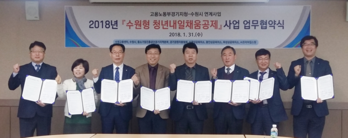 수원시와 고용노동부 경기지청, 중소기업진흥공단 경기지역본부, 경기경영자 총협회, 수원·용인·화성상공회의소, ㈜코리아잡스원은 31일 수원고용복지플러스센터에서 ‘수원형 청년내일채움공제’ 업무협약을 체결하고 청년내일채움공제를 활용한 청년 일자리 창출에 적극적으로 협력하기로 했다.
