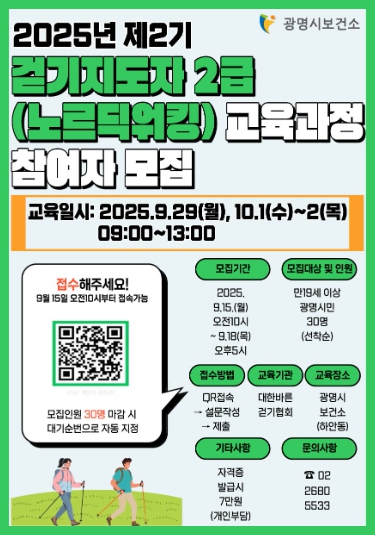 접수는 오는 15일 오전 10시부터 시작하며, 만 19세 이상 걷기에 관심 있는 광명시민을 대상으로 선착순 30명을 모집한다. 신청은 큐알(QR)코드 또는 신청 링크로 할 수 있다.