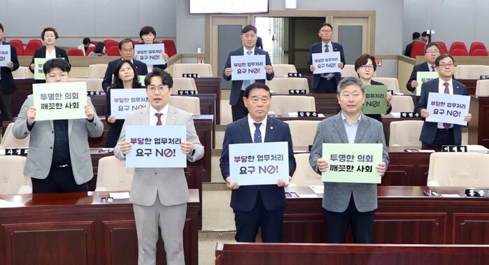 이번 캠페인은 청렴한 의정활동을 실천하고 투명한 조직문화를 확산하기 위해 마련된 자리로, 의원들은 ‘투명한 의회, 깨끗한 사회’, ‘부당한 업무처리 요구 NO’ 문구가 적힌 손 피켓과 카드섹션 퍼포먼스를 펼치며 청렴 의지를 다졌다.