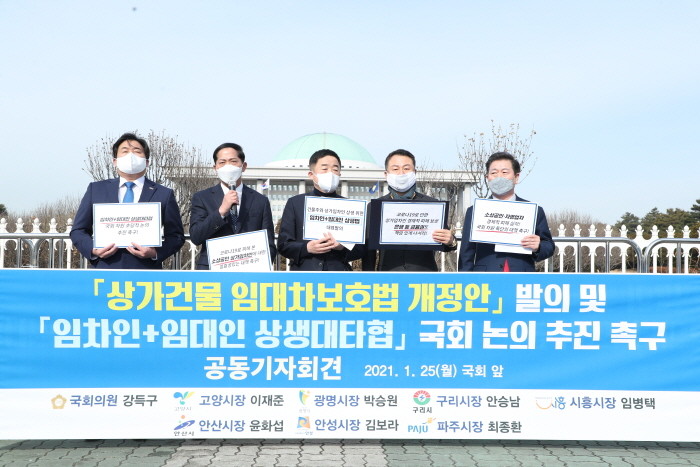 | ▲이재준 고양시장은 25일 국회 앞에서 강득구 국회의원, 경기도 4개 지자체장과 함께 기자회견을 열고 임대료 감면법(상가건물 임대차보호법 일부개정안) 제정을 촉구했다. (사진=고양시 제공) |