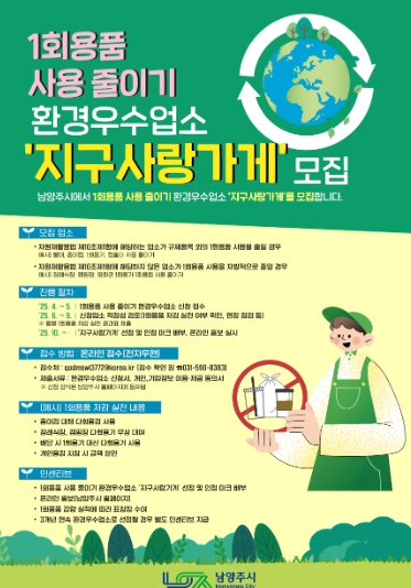 선정된 ‘지구사랑가게’에는 △‘환경 우수 업소’ 인정 마크 배부 △남양주시 홈페이지를 통한 온라인 홍보 △1회용품 감량 실적에 따른 표창장 수여 △3년 연속 선정 시 별도 인센티브 제공 등의 혜택이 주어진다.