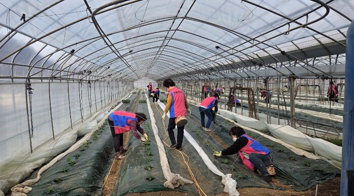 이러한 사정을 누구보다 잘 아는 생활개선회 회원 20여 명은 이날 오이 하우스 9동에 투입돼 모종 심기 작업에 진행했다.