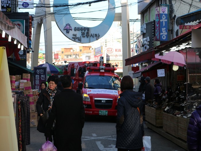 | ▲구리소방서가 전통시장에서 소방차량 출동으로 길 터주기 훈련을 하고 있다.<사진제공=구리소방서> |