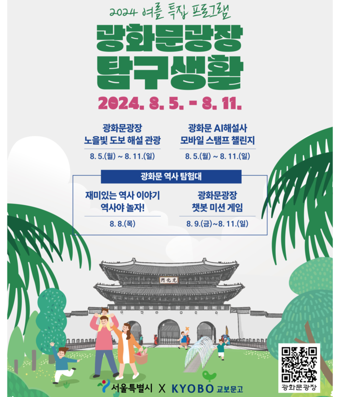 당일 현장 참여인 <광화문 AI 해설사 모바일 스탬프 챌린지>를 제외한 ‘광화문광장 탐구생활’ 예약은 8월 1일(목) 오후 2시부터 서울시 공공서비스예약 사이트에서 할 수 있다. 각 프로그램별로 인원과 행사 기간이 상이해 확인이 필요하다.