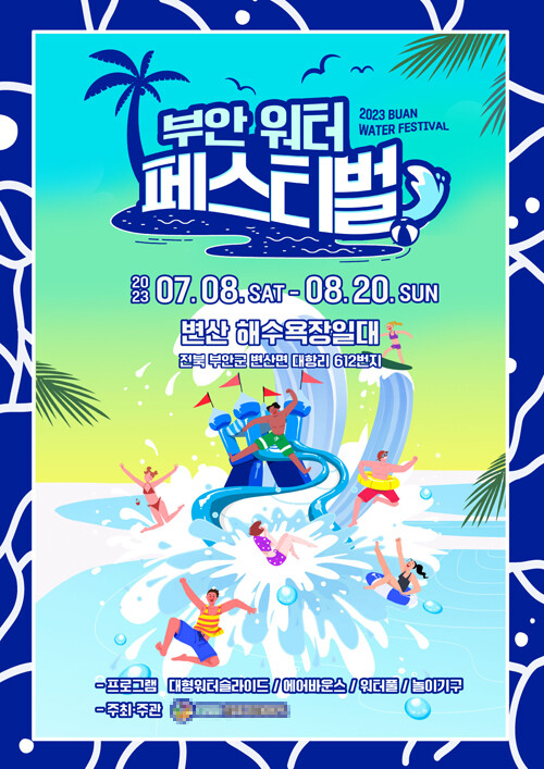 변산해수욕장에 위치한 전북도교육청 교직원 수련원 건너편에서 오늘(8일)부터 내달 20일까지 44일간 개최되며 워터슬라이드, 워터에어바운스, 풀장, 놀이기구 등의 놀거리와 지역주민이 직접 판매하는 먹거리 장터로 구성된다.