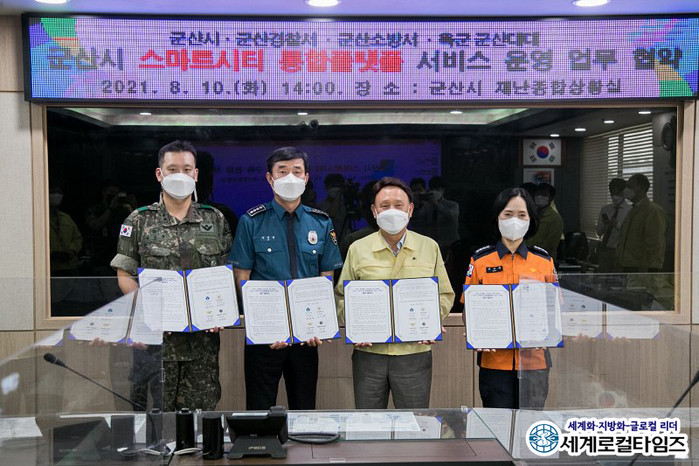 [세계로컬타임즈 조주연 기자] ‘스마트시티 통합플랫폼’을 구축한 전북 군산시가 10일 오후 군산경찰서, 군산소방서, 육군 군산대대와 협약식을 갖고 완료보고회도 진행했다.