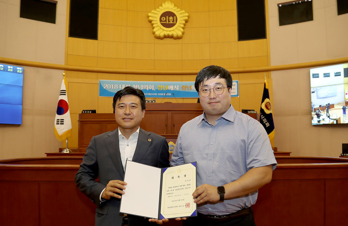 | ▲ 대전시의회 김종천 의장이 시의회 본회의장에서 대전청년정책네트워크 소속 회장과 위촉장을 들고 기념촬영 하고 있다. |