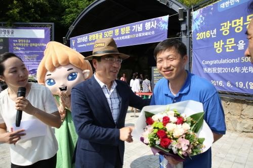 ▲ 양기대 광명시장(오른쪽 두번째)이 19일 올해 광명동굴 50만번째 입장하는 중국인 왕챵씨에 게 꽃다발과 선물을 전달하며 악수하고 있다. <사진제공=광명시청> |