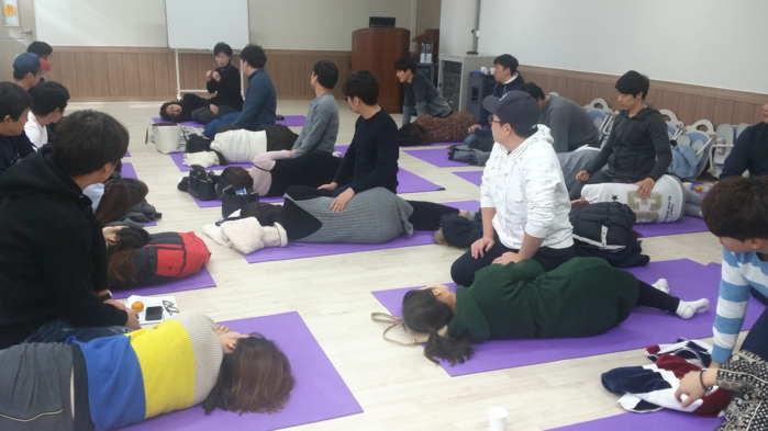 | ▲ 충남 당진시보건소가 진행하고 있는 임산부 건강교실 프로그램 중 '남편과 함께하는 행복한 출산준비'를 수강하는 참가자들이 분만이완법과 호흡법 등을 실습하고 있는 모습. |