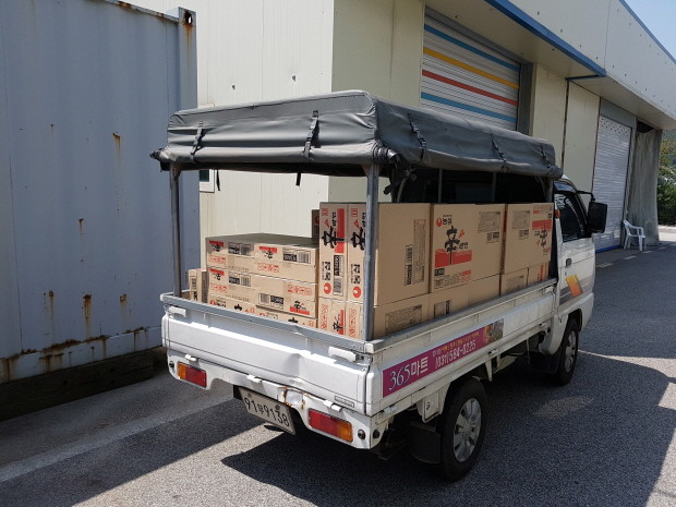 | ▲ 지난달 31일 가평군 청평면사무소에 익명의 독지가가 기탁한 라면을 싣고 온 트럭 모습.<사진제공=가평군청> |