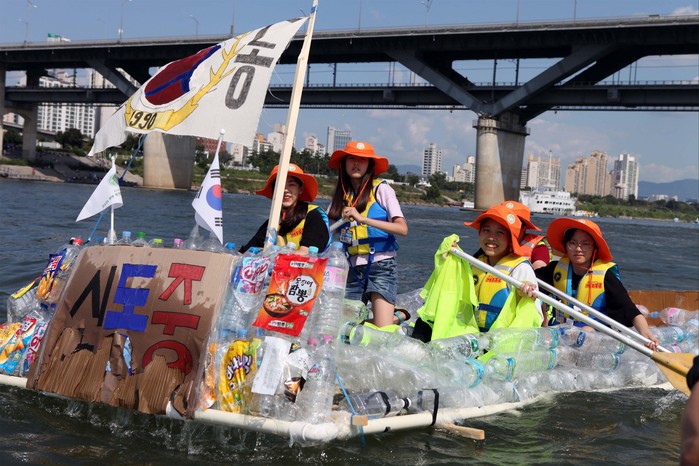 | ▲ 지난해 1회 대회 당시 참가자들이 페트병으로 뗏목을 만들어 한강을 건너고 있다. |