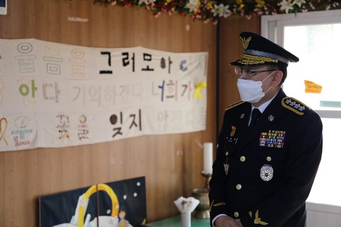 | ▲ 진도 팽목기억관을 방문하고 있는 정봉훈 해양경찰청장(사진=목포해경) |