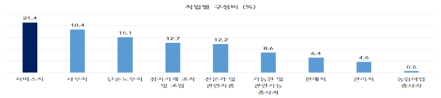 직업별 구성 비중은 서비스직 21.4%, 사무직 18.4%, 단순노무직 15.1%, 장치·기계 조작 및 조립 12.7%, 전문가 및 관련직종 12.2%, 기능원 및 관련기능 종사자 8.6%, 판매직 6.4%, 관리직 4.6%, 농림어업 종사자 0.6% 순으로 나타났다.