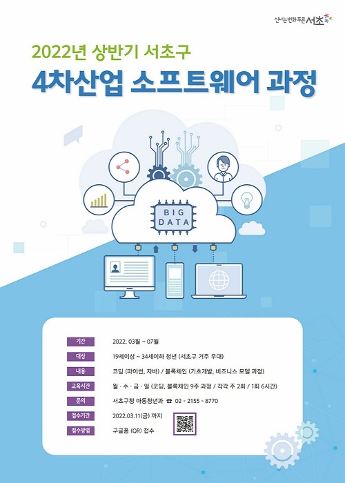 모집대상은 만19세 이상부터 만 34세 이하 청년이며, 블록체인 과정 40명, 코딩 과정 50명 총 90명을 선정할 계획이다. 접수는 다음달 11일까지 서초구청 홈페이지나 구글 폼을 이용한 QR코드로 1개 과정 또는 2개 과정 모두 신청이 가능하다.
