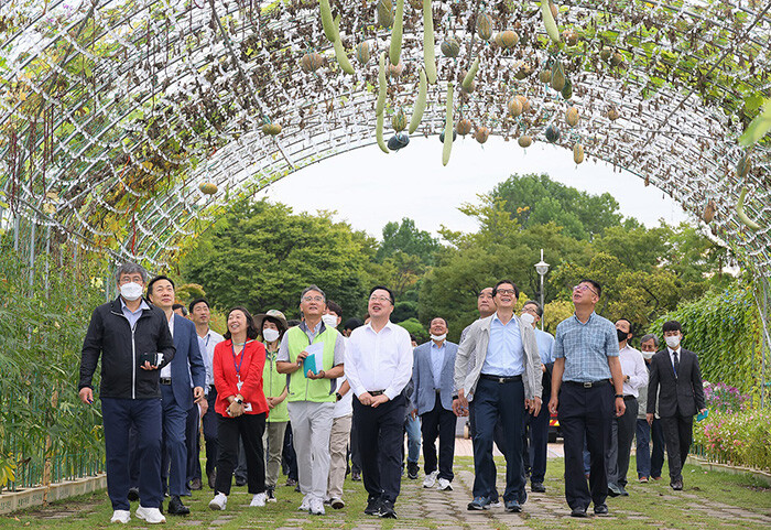 [세계로컬타임즈 민순혜 기자] 이장우 대전시장은 13일 아침 행정부시장, 경제과학부시장, 실.국장 등 간부공무원 및 공원녹지 직원들과 함께 도심 속 최대 규모인 한밭수목원에서 아침탐방을 실시했다.