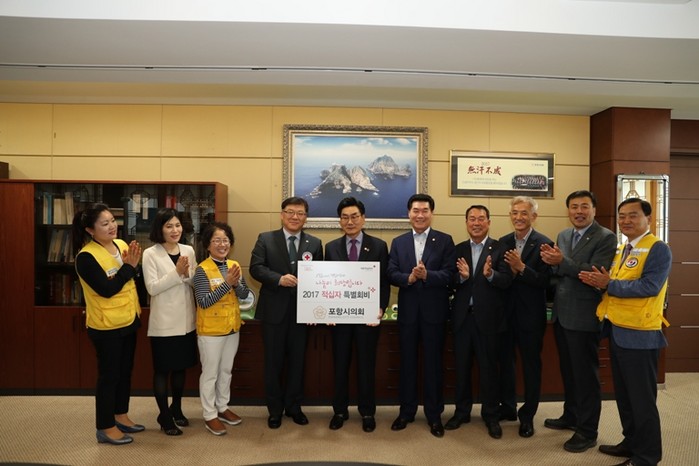 이날 특별회비 전달식에는 문명호 의장, 정해종 부의장, 정수화 의회운영위원장을 비롯해 대한적십자 경북지사 이종하 사무처장과 포항시지구협의회 임원들이 참석했다.